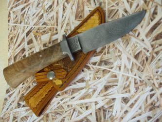 Bowie with swedge and double guard. Damascus steel. 5 1/2 inch blade, 10 1/2 inches overall length. Stabilized Red Oak Burl handle. Stainless pins. Damascus guard. Comes with custom inlayed and tooled, hand sewn leather sheath.