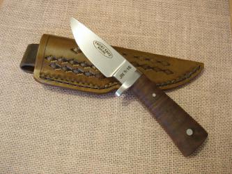 Hunter knife hand forged from 1084 steel. 3 3/4 inch blade, 7 3/4 inches overall length. Carbon steel guard. Mortised stabilized walnut handle with stainless pins. Comes with hand tooled and hand sewn leather sheath.