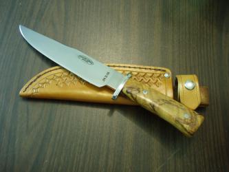 Skinner made from 1084 steel. 4 1/4 inch blade, 9 inches overall length. Stabilized Curly Maple handle. Brass pins and bolsters. Comes with custom hand tooled and hand sewn leather sheath.