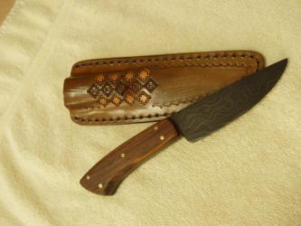 Damascus hunter. 4 1/2 inch blade, 8 3/4 inch overall length. Features thumb notches filing and brass pins in beautiful Cocobolo handle. Comes with custom fit hand tooled and hand stitched leather sheath.