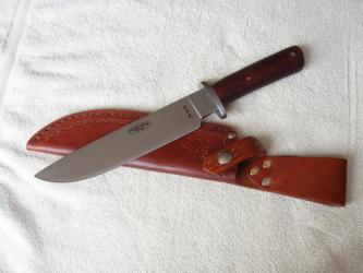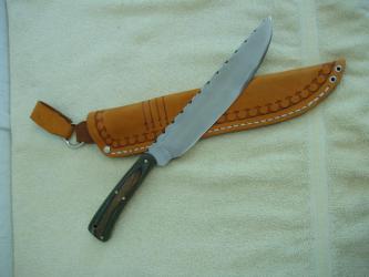 Big, beautiful and useful - this 13 1/2 inch camp knife can get the job done with its 8 1/4 inch blade. 5160 steel. Features full length vine pattern filing. Laminated wood handle with brass pins. Heavy duty hand made sheath.