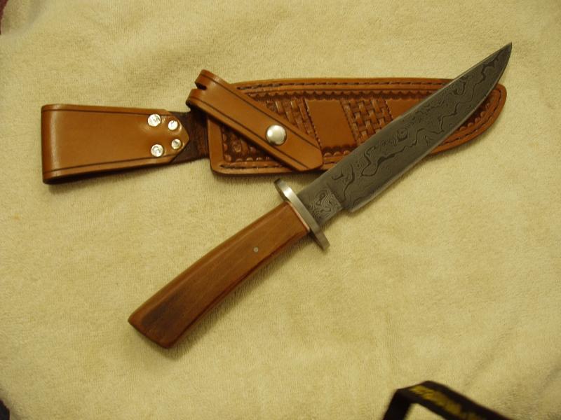 Damascus Bowie (320 layers). 8 1/8 inch blade, 13 1/2 overall. Osage Orange handle. Stainless pins and damascus bolsters. Includes custom fit hand sewn and tooled leather sheath.