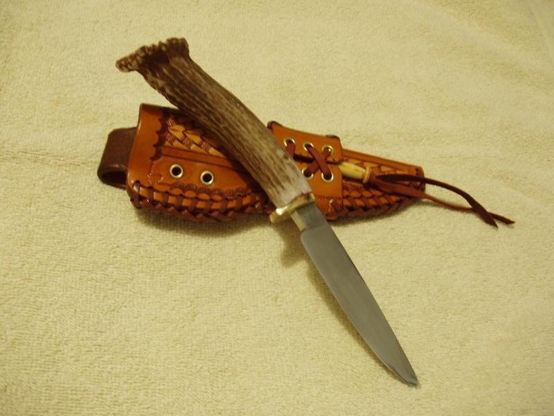Hand Forged Hunter Knife made from 1084 steel. 3 3/4 inch blade, 8 3/4 inches overall length. Deer antler handle. Brass pins and bolsters. Comes with custom fit hand tooled and laced leather sheath.