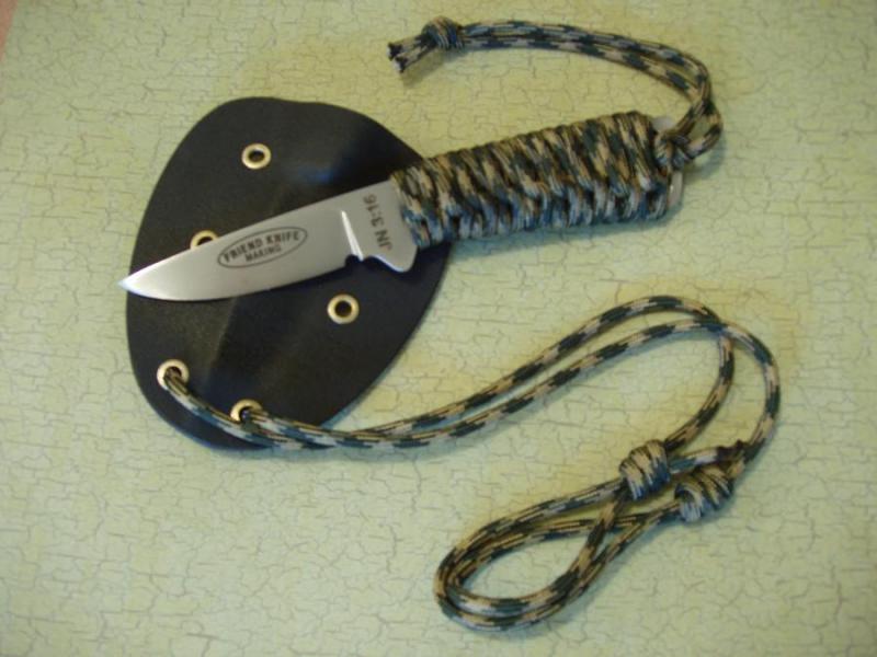 Neck Knife - High carbon sawblade. 3 inch blade, 7 inches overall length. Parachord wrapped handle. Kydex neck sheath with adjustable lanyard.