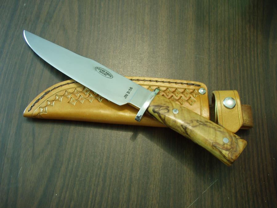 Bowie Camp Knife. 5160 steel with 8 inch blade. 12 1/2 inches overall length. Stainless bolsters. Stabilized Spaulted Maple mortised handle with stainless pins. Comes with custom fit heavy duty leather hand tooled and hand sewn sheath.
